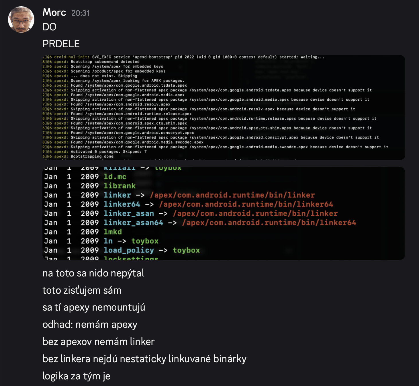 V postupnosti: screenshot z dmesgu kde je zoznam "apexov" ktoré sa nepodarilo načítať, screenshot z ls -la na zložku /system/bin kde je videť pokazené symlinky na zrovna linker a linker64 ktoré sa mali nachádzať zrovna v apex zložke. Vec sa má tak, staticky linkuvané binárky logicky idú, sú staticky linkuvané. Dynamicky linkuvané binárky ale odkazujú na henten vyšší spomenutý /system/bin/linker kerý samozrejme neexistuval.