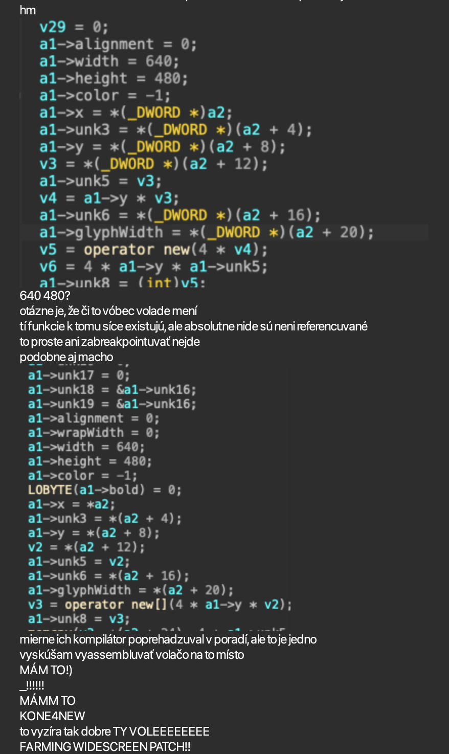 Počas celej plejády nálad a pocitov som došóv minimálne k jednej veci. Treba mi robiť počas disassemblu prestávky. Ono to krátkodobé uvolnení, rozvázaní mysle mi fakt pomóže sa potom k veci vrátiť a dospeť k tomu, že to čo sa snažím nájsť asi aj tak bude možno inde. Keď odmyslím to, že som medzičasom z dekompilácie macOS binárky stihol vyskladať už jako taký struct a ten dokonca prehodil do tej Windowsovej dekompilácie tak som si s ním neskutočne pomohol. Totižto v konštruktori pre FontRenderer sa nastavujú hodnoty pre kopu premenných tej jednej jedinej inštancie čo sa v celom engine používa. To že som konštruktor vytipuval z dekompilácií tej macOSovej a napasuval na Windowsovú je ďalšá vec. Každopádne ide o to, že tam v ňom sa na moje prekvapení po jakomtakom vyplnení structu začali objavuvať zaujímavé veci jako napríklad this->width = 640; a this->height = 480;