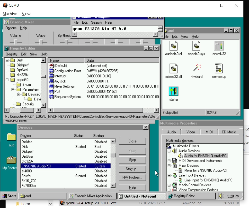 There seems to be a some kind of regression on the current upstream branch of QEMU as of writing, where the Ensoniq/Creative AudioPCI 128 (ES1370) emulation seems to be broken on Windows NT 4.0. (albeit unknown for other operating systems, haven't tried)